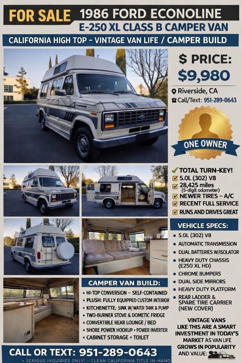 1986 Ford E250 XL High-Top Class B Camper Van-Loaded-Serviced-1 Owner-Xtra Clean