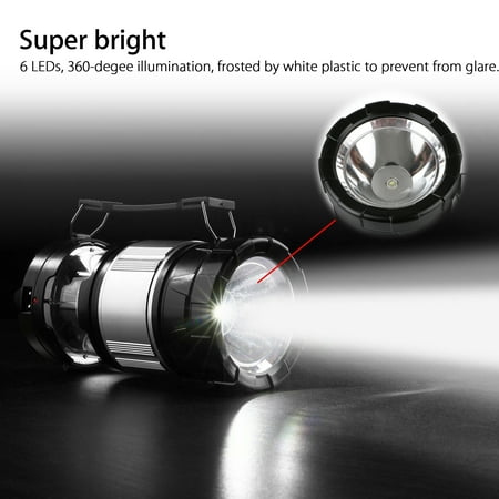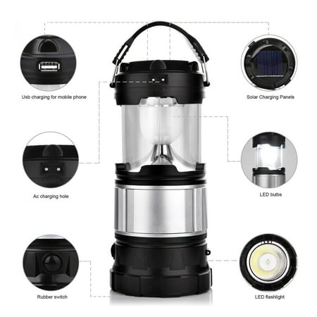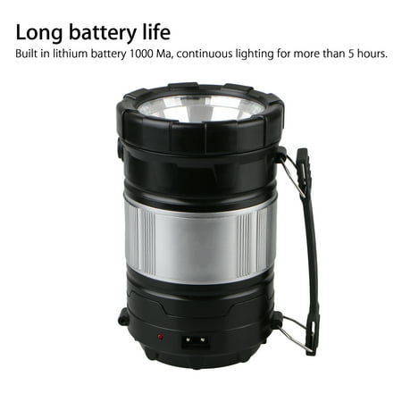 Built-in 6 pcs LED, super bright 360 degree LEDoutdoor camping lamp.Solar and DC charging 2 power option, convenience use in home and outdoor.Built in lithium battery 1000 Ma, continuous lighting for more than 5 hours.