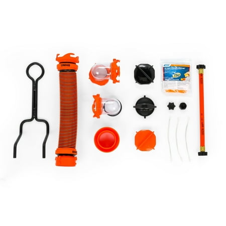 Ready-to-use kit includes everything needed to transport waste from your RV or trailer to a dump station when you?re parked too far away for an rv sewer hose. Kit includes accessories to clean, maintain and store the tote tank when not in use.Large, heavy-duty, no-flat wheels with bearings make transporting the tow tank smooth and effortless. Removable steel tow adapter allows you to easily roll the tote tank as you would with a suitcase or luggage. You can also transport it by towing it slowly behind a golf cart or truckThe low drain hole ensures that the tote tank empties completely, and the smooth interior is easy to clean via the integrated tank rinser.The integrated ladder hook can sturdily clamp on to RV or camper ladder when not in use and the body of the tote tank features grooves to securely strap it in place.Constructed of extremely durable blow molded, UV stabilized HDPE that won?t leak or deteriorate in the sun with a two year warranty. Includes 3? RhinoEXTREME sewer hose with bayonet and lug fittings, 15? water hose rinse adapter, clear elbow with 4 in 1 adapter, clear double bayonet elbow, 3 storage caps, 2 caps with lanyards for rinse connections, steel tow adapter and TST orange drop-ins