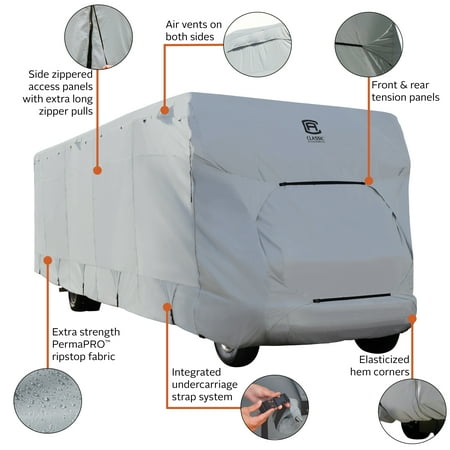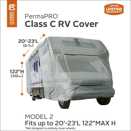 Class C Motorhome Cover: Fits 20′ – 23′ long, 122″ from ground to roofCamper cover includes lifetime warrantyPermaPRO ripstop fabric defends your RV from water, dirt, and sun damage. Air vents combine with quick-drying PermaPRO fabric to reduce wind stress and inside moisture.Adjustable tension panels and elasticized hem corners provide a custom-like fit while the zippered panels allow access to the RV doors and storage compartments on all four sidesLong zipper pulls reduce the need for a ladder. Integrated straps and toss bag system make installation simple and quick. The zippered storage bag can be unzipped and expanded for easy packing