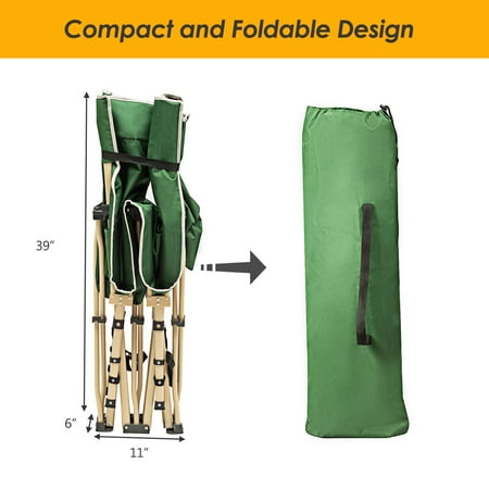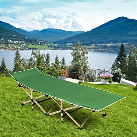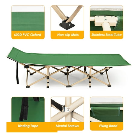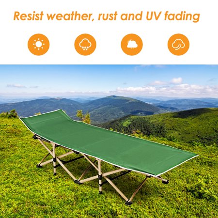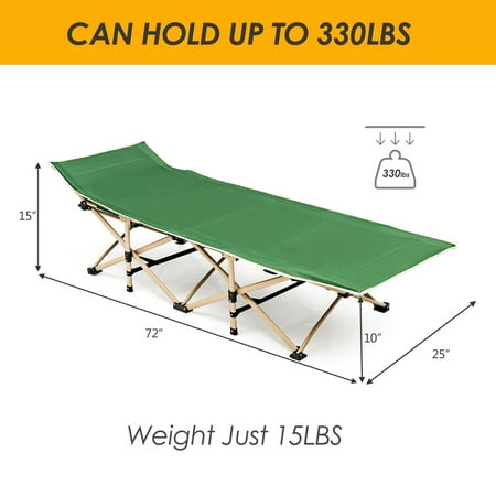 Lightweight and portable camping bed is perfect for the outdoorsWidely used for camping, patio and pool furniture or used in offices and beauty salonsOverall Dimension: 72”*25”*15” (L*W*H)Weight Capacity: 330lbsMaterial: Steel Frame and 600D