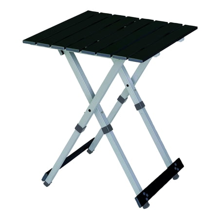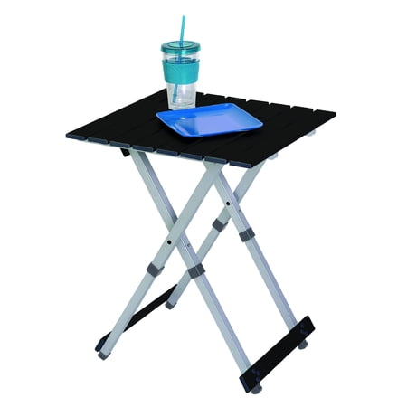 Aluminum-frame and table top Telescoping leg design allows a full-sized table to fold compactly Seats two people or use as side table Open size: 18 x 19.9 x 23.8 in (45.7 x 50.5 x 60.5 cm) Folded size: 18 x 2 x 17.9 in (45.7 x 5 x 45.5 cm) Weight capacity: 60 lb (27.3 kg) Unit weight: 4 lb (1.8 kg)