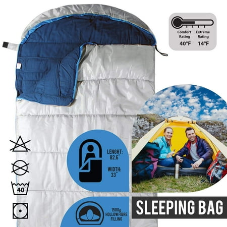 3 SEASON ULTRALIGHT SLEEPING BAG. The cool weather sleeping bag is made with materials which do not retain moisture nor does it allow external moisture to sip in. This is due to polyester usage on the external and internal lining. In addition, it has hollow cotton filling, giving it a temperature rating of +15°F and +40°F.FITS ANYONE UP TO 6’4: This long sleeping bag is one of the biggest and widest out there, great for tall guys and active sleepers who like to move around. Dimensions: 83 x 33 inCOMPRESSED SACK: Convenient internal stuff pocket for store your belongings and a compressed oxford sack is included to pack. Pack weight: 5.9lbs/2.7kg. You deserve this outdoor adult sleeping bag.VISUALLY PLEASING WITH WIDE RANGE OF COLORS. It cleverly combines function and aesthetics at the same time and for this reason, it comes with a wide array of color options to choose from.PERFECT FOR THE 5-BILLION STAR HOTEL EXPERIENCE: Cozy up in this comfy sleeping bag as you gaze at the Milky Way and listen to the crackling fire and sounds of nature.