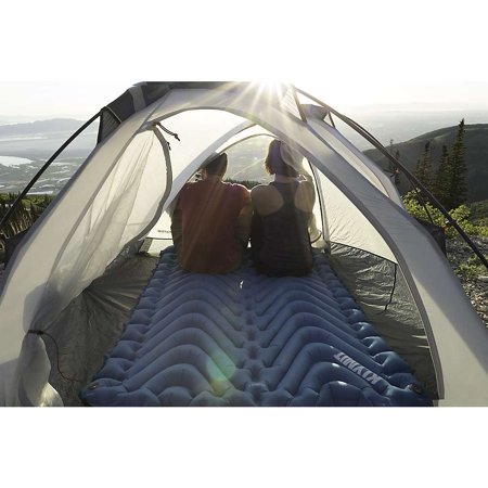 Look no further for the ideal sleeping pad for partners with the Klymit Double V Sleeping PadV Chamber construction limits the amount of air that moves between the two sidesComes with a pump integrated that inflates in 8 to 10 pumpsDurable construction so that you can sleep outside under the stars75 denier construction provides extra protection against tears and puncturesAnti microbial laminate protects against the growth of fungus and bacteria that can cause odors and material damageColor: BluePack size dimensions (L x W): 5 x 9 inchesAssembled dimensions (L x W x H): 74 x 47 x 3 inchesWeight: 2.70 poundsManufacturer warranty: Lifetime manufacturer warranty