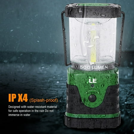Enough brightnessIts full brightness is about 500 lumen, making it bright enough to light up your space.With 360 degree beam angle, it can gives off pretty even light to light up your space.Three lighting modesThis delicate handy light can provide you with three different modes, including full brightness (500lm), half brightness (250lm) and flashing mode (500lm), to meet your specific lighting needs.Portable lightThis portable light uses 3 D batteries(not included) as power supply, which enables you to move the light anywhere youneed a bright handy light. Say, you can use it for dog walking, camping,fishing, emergency usage or other activities.Hanging function availableThe hook at the base enables you to hang it upside down, and you can even take the top off to get better light when lighting up a big area.Green indicator lightIt has a little blinking light on the front, making it easy to find and help to keep you from stumbling around in the dark as you move from one room to the other after sundown.Skid resistance baseBy adopting qualified silicone on the base, the light is skid resistance. You can put it on a desk to light up your room without worrying about that the light will slipped off to the ground.Emergency lightingIf your area gets lot of thunderstorms and power outages, you won’t miss this light. When had no power due to a storm, you can depend on this portable light as it is able to light up your space and provide you with enough brightness.Wattage (W): 9Brightness (lm): 500LED Quantity: 3Light Color: Daylight WhiteColor Temperature (K): 6000-7000Dimmable: Non-dimmableInput Voltage (v): 4.5Length (in): 3.74Width (in): 3.39Height (in): 7.24Net Weight (lb): 0.82Weight (lb): 0.94Material: PlasticWaterproof: NoCertification: CE, RoHSWarranty: 1 Year