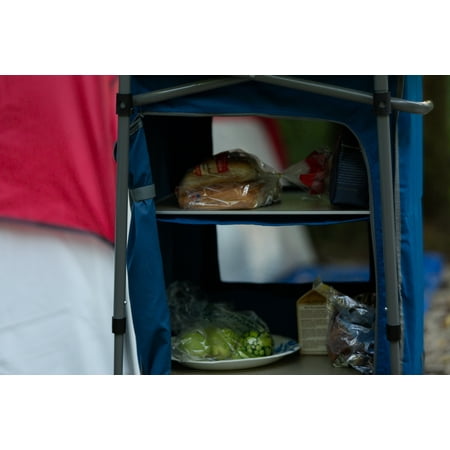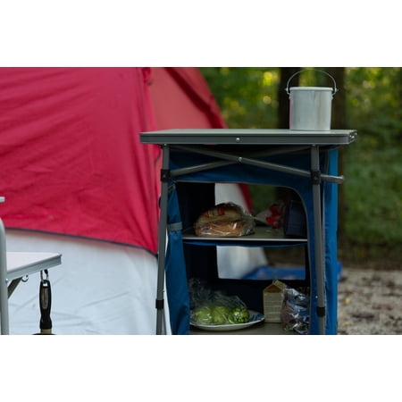Ozark Trail 3-Shelf Collapsible Cabinet with Table Top, BlueTelescopic legs adjust to uneven terrain and help for compact storage Folds easily in seconds for quick takedown when not in use Durable steel frame with easy-to-clean table top 3 separate storage areas for maximum organization at the campsite Weight capacity: 66 lbs Dimensions: 23.62″L x 18.90″W x 36.61″H Folding cabinet with 1-year warranty Model# CC-6012Features a door with a zippered closure to help secure the contents from wandering critters Fabric cabinet shape: rectangular Color: blue