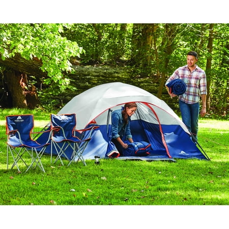 Ozark Trail 6 Piece Camping ComboIncludes: 4-person instant tent, two foldable chairs, two sleeping bags and a collapsible LED LanternChairs hold up to 225 pounds and have built-in cup holders30 lumen LED lantern with a run time of 9 hours (3 AA batteries not included)Chairs constructed with a durable steel frame40 degree sleeping bags that are machine washableRemovable rainfly and mesh windows for added ventilationModel Number: 30564