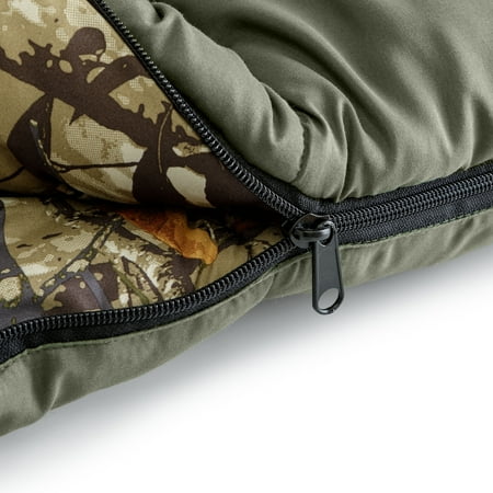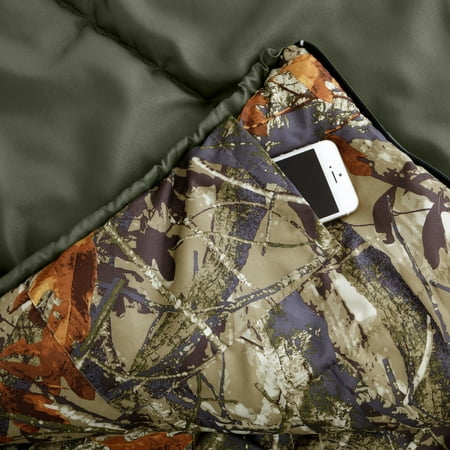 Ozark Trail Camo Hooded Sleeping Bag Built-in hood for additional warmthPerfect for cooler climatesDurable and easy to washCamo print on bagGoes perfectly with the Ozark Trail Rectangular Sleeping Bag LinerCellphone pocket for quick access at nightDrawstring around shoulders to keep cold air outBuilt-in pack straps for quick rollup in the morningGreat for family camping, weekend camping or car campingDimensions: 78″ x 36″Model Number: 30605