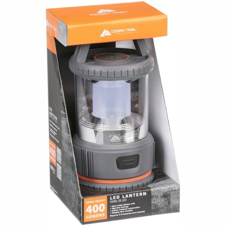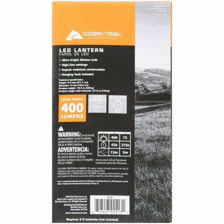 Ozark Trail Outdoor Equipment 400 Lumen LED Camping Lantern High quality lantern perfect for use on camping trips or backyard partiesLightweight for easy carry and transportationThe convenient hook allows you to hang lantern or rest it on a tableHigh setting has 400 lumens brightness and lasts for 42 hoursLow setting has 50 lumens brightness and lasts for up to 275 hours3D batteries required (not included)