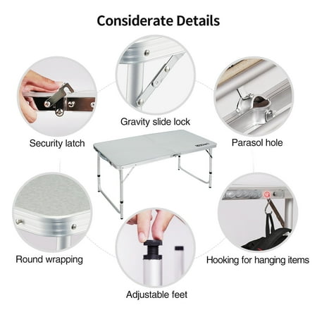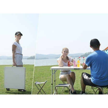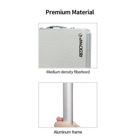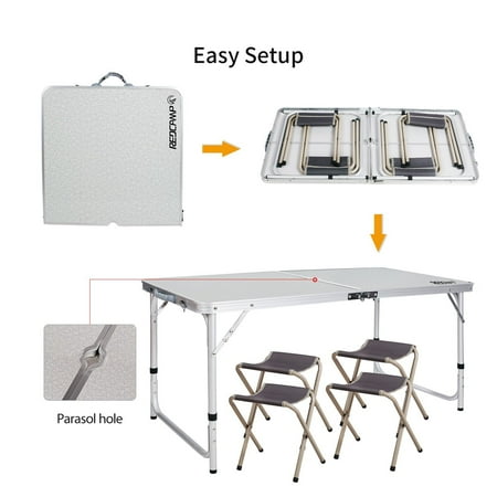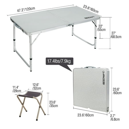REDCAMP foldable camping table: * Aluminum frame, moisture proof top for weather resistance. * Fully molded top, easy to clean surface. * Heavy duty table folds in the center, esay to carry. * Two adjustable height, support up to 110lbs. * ‘U’ shaped support tube strengthen the stabitilty of the table. * Sturdy stools are made out of double layer Oxford fabric and powder coated steel tube.