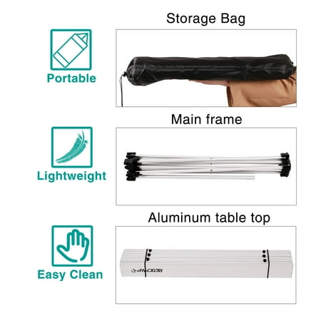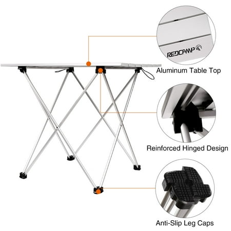 REDCAMP table:Material: aluminumUnfolding size: 15.7”x13.8”x11.2”(40x35x28.5cm)Folding Size: 15.7”x2.4”x5.9” Weight: 2LBS.